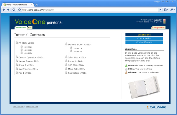 Questa pagina mostra gli interni configurati sul sistema ed il loro stato. Se ad accedere a questa pagina è un utente che ha associato un interno od un interno virtuale questo vedrà gli interni registrati al centralino come link. Cliccando sopra al collegamento si aprirà uno specchietto che permette di lanciare una chiamata dal proprio client registrato verso l’interno selezionato.